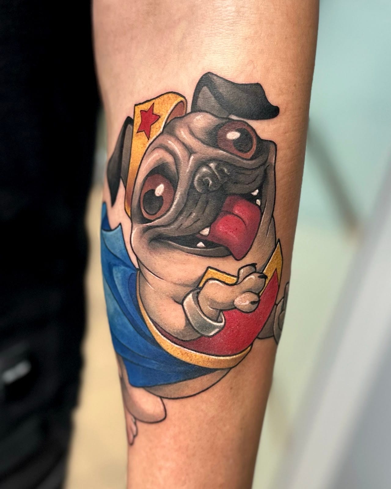 Еще я делала татуировки на основе мемов — придумали с клиентом изобразить орущего сурка. Но больше всего люблю изображать мультяшные стилизации домашних питомцев. Например, превратила любимого мопса клиента в чудо-женщину, а кошек другого клиента — в Джокера и Харли Квинн.