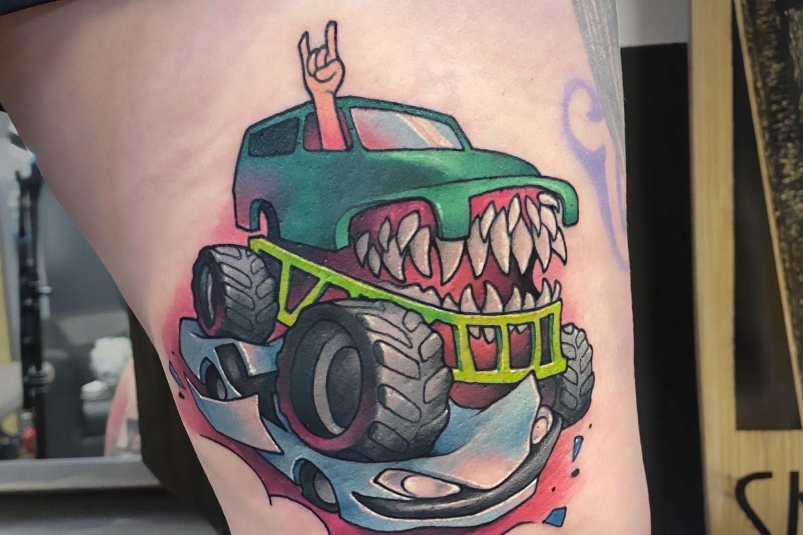 А еще была клиентка из Германии, которая хотела зафиксировать памятное событие. В качестве референса заказчица принесла фотографию, где она сидит на своем монстр-траке, а рядом раздавленный ею автомобиль.