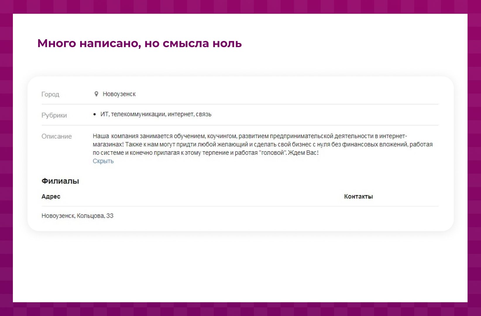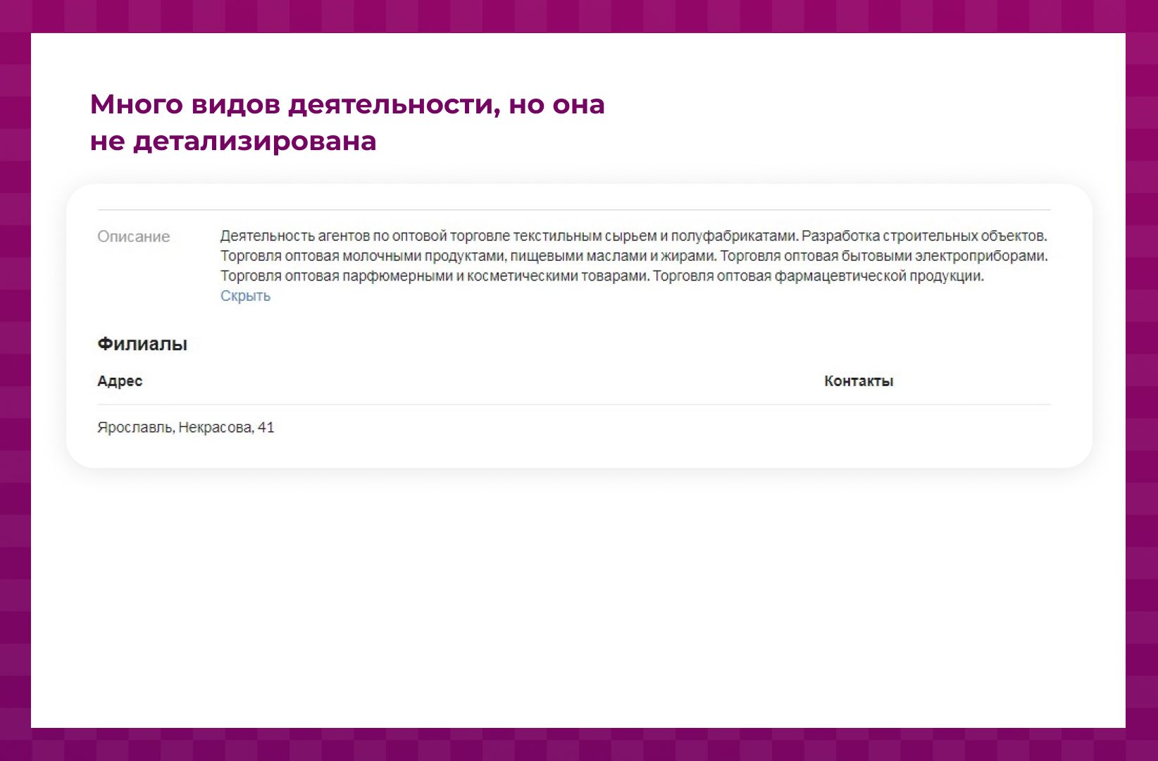 🐼 Все, у кого много видов деятельности (но она не детализирована), например, «Мы работаем по 18 направлениям», при этом о компании нет информации в Google — компания может оказаться пустышкой.