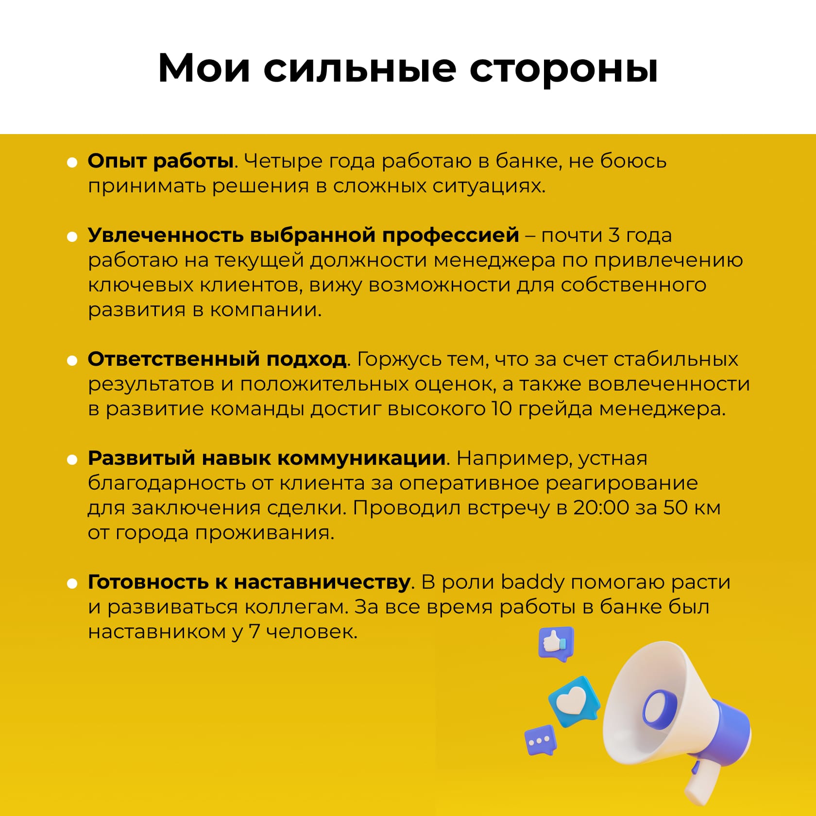 Совет: с цифрами важно не переборщить и приводить только достоверную информацию. Когда цифры округляют, все невольно думают, что это какая-то уловка, обман. Поэтому лучше говорить максимально конкретно, как это было в жизни. Например, «пять лет работал в продажах» звучит красиво, но «четыре с половиной года» или «осенью будет пять лет, как я…» — честнее, вызовет больше доверия.