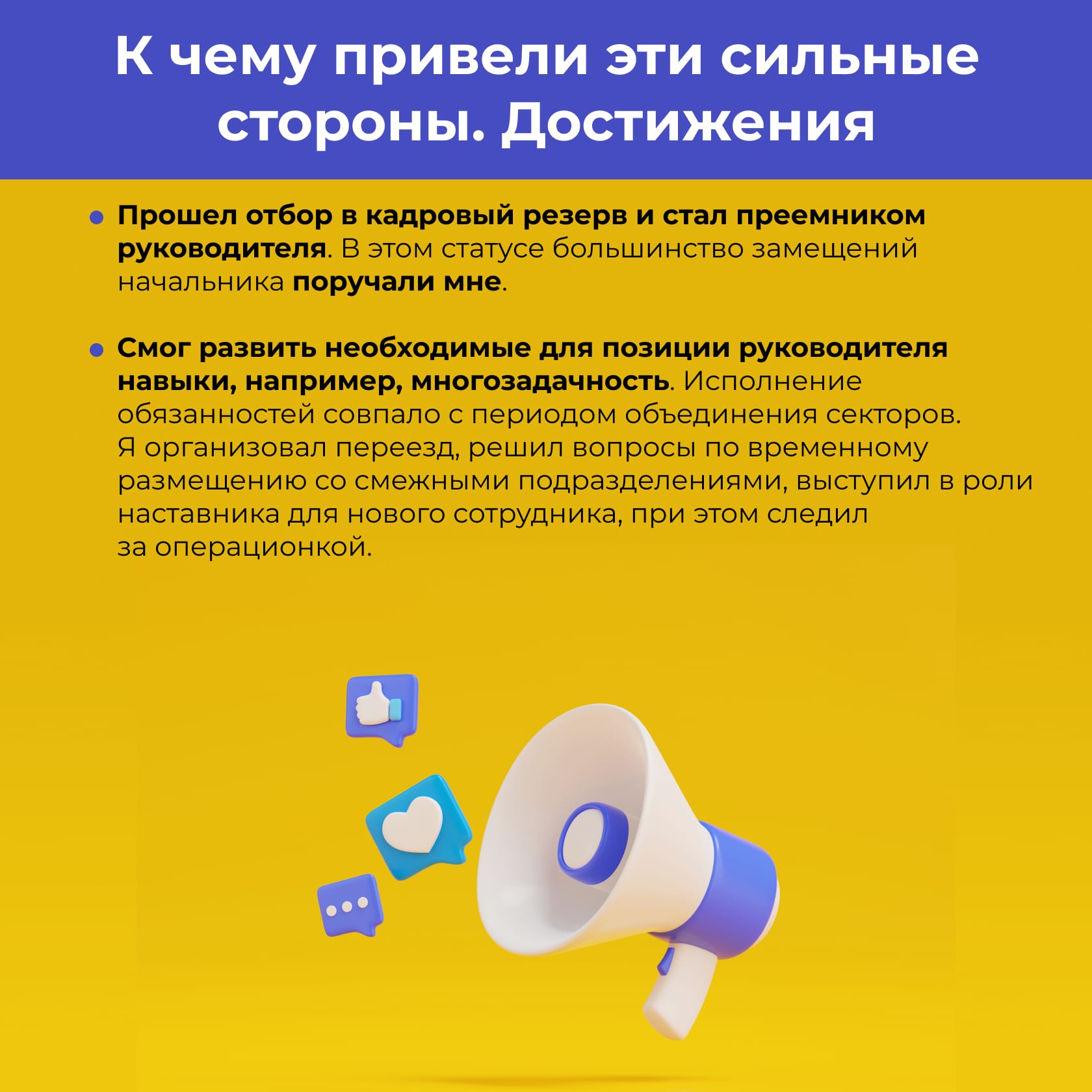 - Говорите не только о прошлом. Добавьте 1-2 цели на ближайшее будущее — так покажете мотивацию и перспективы развития.