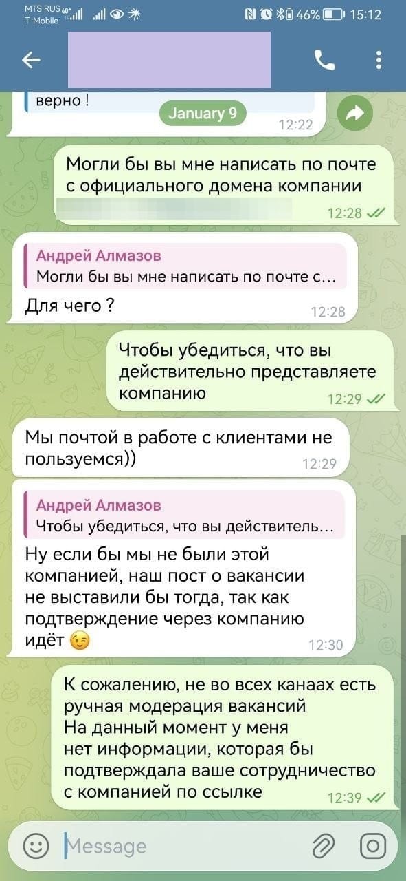 Какие-либо «звоночки» появляются только когда кандидат вступает в переписку. Например, «HR» сразу дает очень положительную обратную связь и говорит, что «обязательно подберем подходящий вариант». О компании собеседник ничего не рассказывает, либо просто скидывает ссылку на сайт. Если попросить написать с официальной почты, «HR» откажется это делать.