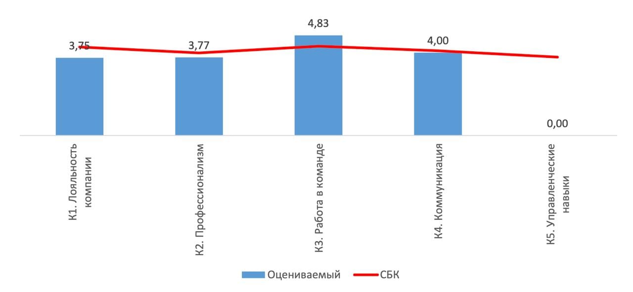 На графике красной линией обозначена граница результатов по компании, а в столбцах — средние результаты по оцениваемому сотруднику. Из него легко определить, какие компетенции находятся выше или ниже среднего показателя.