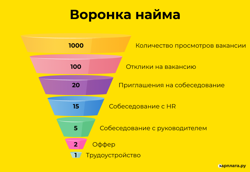 Структура есть и в работе рекрутеров. Чтобы поиск сотрудников был эффективным, анализируют путь кандидата по этапам — это называется воронкой найма.