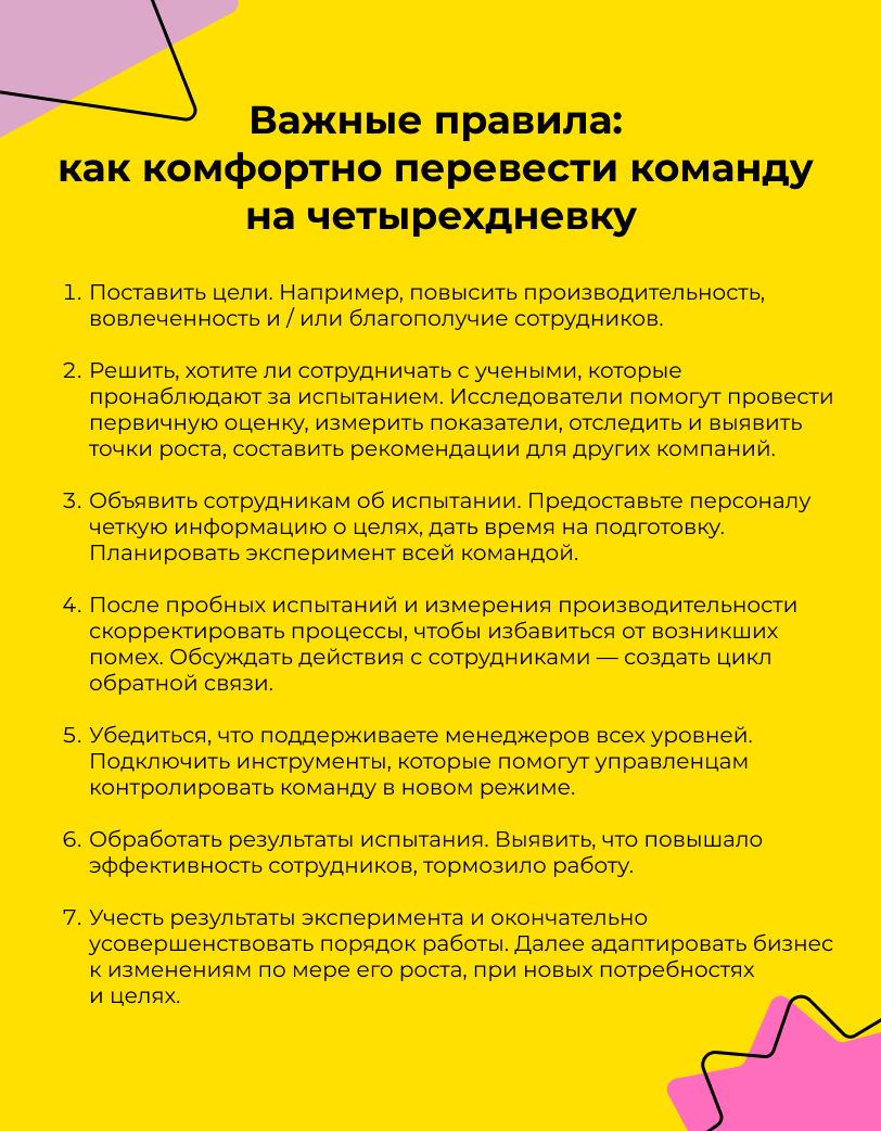 Мы на пару лет переходили на 4-дневку. Действовали поэтапно и через эксперименты: какое-то время работали понедельник–четверг, какое-то — вторник–пятница, пробовали и схему с двумя мини-неделями (понедельник–вторник и четверг–пятница рабочие).
