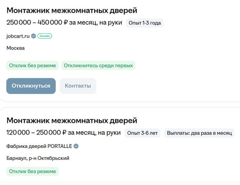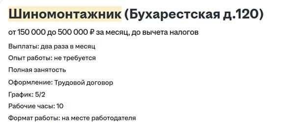 Отдельная группа вакансий — для шиномонтажников, в середине весны и осени как раз наступает пик сезона в этой сфере. Топовые предложения начинаются сразу с шестизначных цифр, а потолок доходит до полумиллиона в месяц.