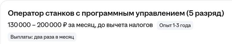 У технологов и наладчиков станков с ЧПУ зарплаты выше. Например, в Уфе, Самаре, Нижнем Новгороде и Казани инжиниринговая IT-компания предлагает инженеру-технологу от 190 тысяч в месяц. В Санкт-Петербурге оператору-наладчику станков токарно-фрезерной группы готовы платить от 170 тысяч, в Первоуральске — от 172 до 205 тысяч рублей.