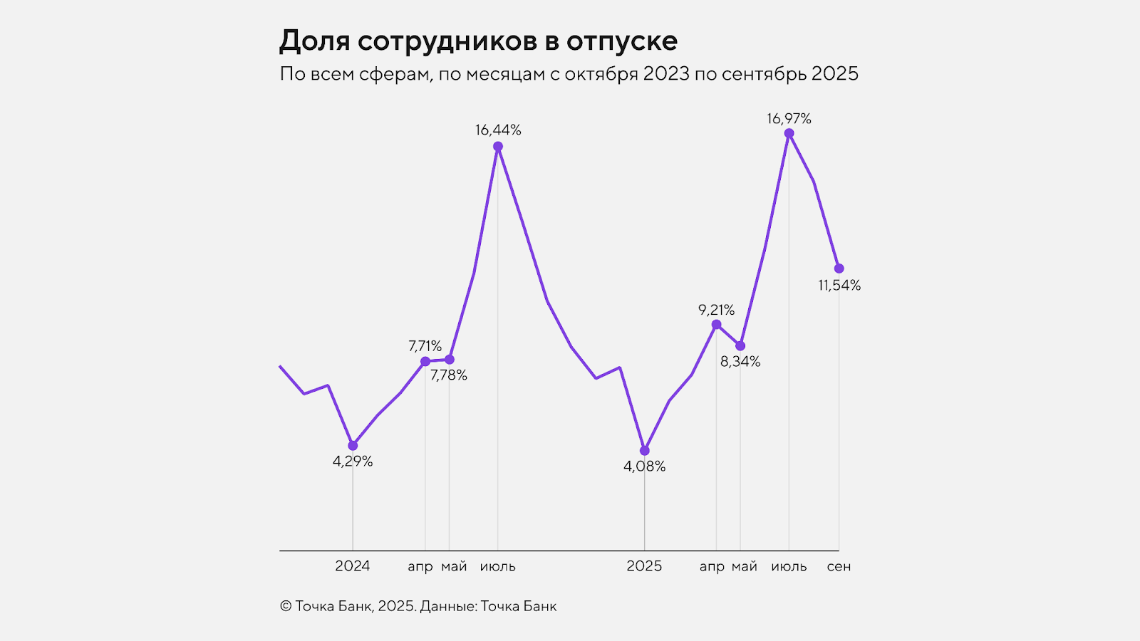 В сельском хозяйстве график определяется производственным циклом. Не до отдыха в посевную — обычно апрель (доля отдыхающих сотрудников — 3,8%) и на уборке урожая (обычно это сентябрь, 6,9%). Поэтому пик отпусков смещается на позднюю осень и зиму.