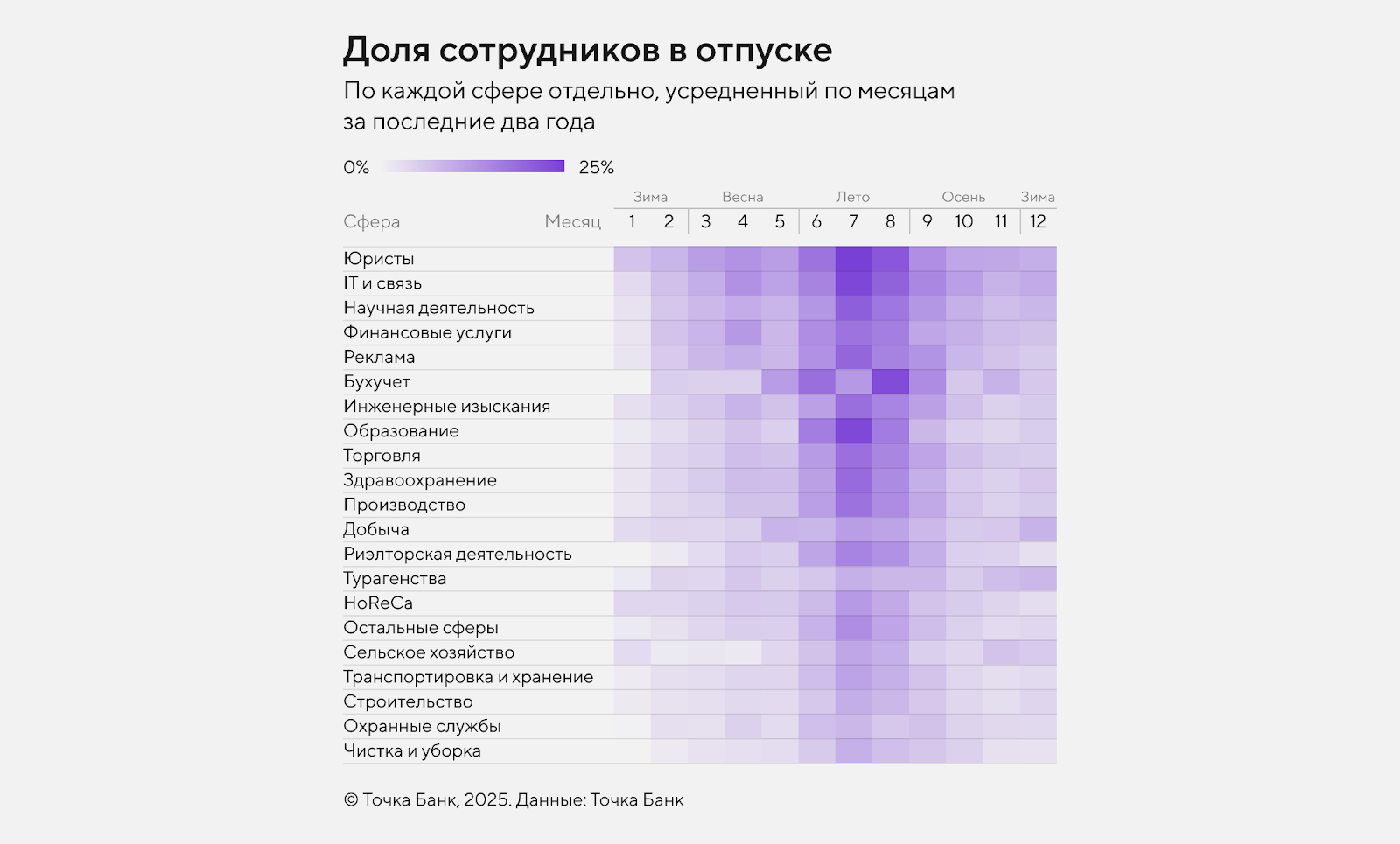 В отраслях, где есть сезонный спад после праздников, например, HoReCa сотрудники реже, чем в других сферах отдыхают летом, зато чаще — в январе. Реже всех летом отдыхают сотрудники турагентств, поскольку в это время у них пик нагрузки. Их отпуска более равномерно распределены по году.