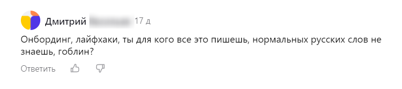 Кроме того, есть борцы за чистоту русского языка, которые активно отрицают англицизмы в любой коммуникации. Например, когда в наши профильные статьи для HR-специалистов в Дзен-канале случайно заглядывают читатели, далекие от темы, появляются такие комментарии: